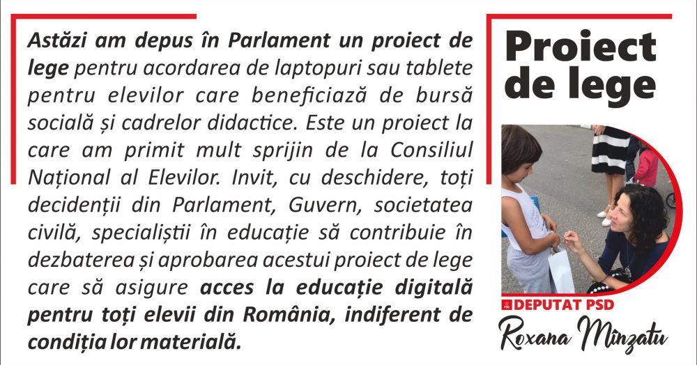 „În contextul actual generat de pandemia COVID-19, trebuie să ne asigurăm că actul educațional continuă cu cât mai puține interferențe. Sistarea activității la clasă a mutat procesul educațional integral în mediul online. Însă, la această ”școală online” nu au acces decât o parte dintre elevi. În lipsa unui computer sau a unei tablete, în lipsa conexiunii la internet, sute de mii de elevi din România sunt azi excluși total din procesul educațional. Din păcate, vorbim doar de o estimare, numărul exact al acestora fiind o enigmă chiar și pentru autorități. Tocmai de aceea, lucrând îndeaproape cu Consiliului Național al Elevilor, am depus în Parlamentul acest proiect de lege, astfel încât elevii care îndeplinesc condițiile pentru a primi bursă socială, precum și profesorii, să beneficieze de laptop sau tabletă cu conexiune la internet, pentru a putea participa la desfășurarea cursurilor online și pentru a folosi platformele educaționale digitale atât în mod curent, în completarea activității de la clasă cât și în perioade de criză, de calamitate, când studiul se realizează exclusiv online, la domiciliu.” a declarat Roxana Mînzatu, deputat PSD.