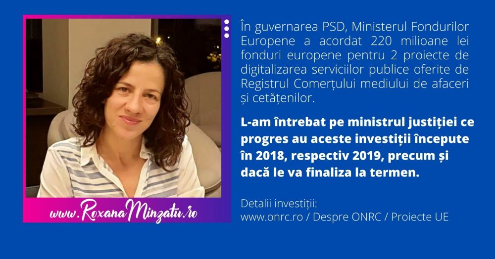 În 2018 și 2019 ONRC a solicitat și Ministerul Fondurilor Europene a aprobat finanțare din fonduri europene de circa 220 milioane RON pentru două proiecte complexe de digitalizare a serviciilor pentru mediului de afaceri. Astfel, la preluarea mandatului dumneavoastră de Ministru al Justiției, ați preluat și responsabilitatea de a continua realizarea acestor două proiecte esențiale pentru mediul de afaceri începute în guvernarea PSD, finanțate în cadrul POC 2014-2020, Programul Operațional Competitivitate.