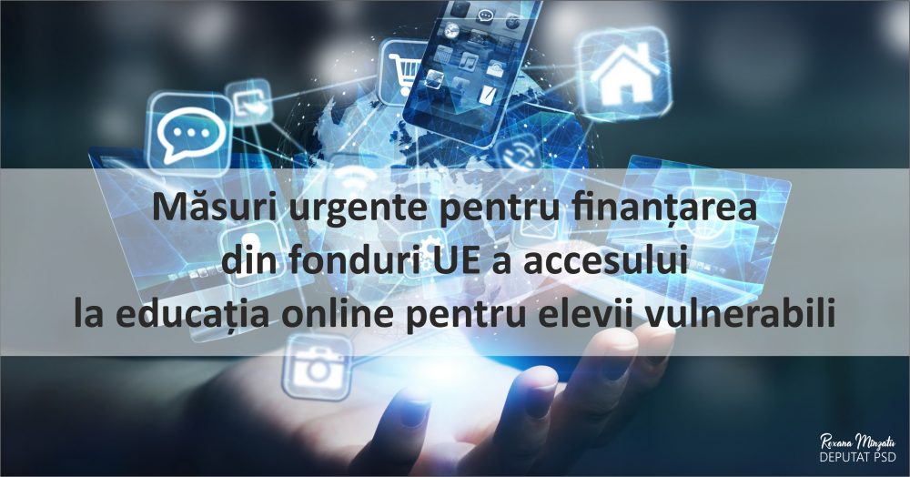 - Punctual, de ce nu ați dispus până acum alocarea fonduri UE pentru o intervenție care să asigure accesul nediscriminatoriu, echitabil al tuturor elevilor la educația online. Este necesar să lansați un apel prin care Ministerul Fondurilor Europene să susțină achiziția de dispozitive tip tabletă educațională sau laptop, inclusiv conexiunea la Internet, pentru acei elevi din categorii vulnerabile, care au fost identificați ca neavând acces în familie la tehnologia digitală necesară accesării platformelor educaționale online. De asemenea, în grupul țintă trebuie incluse și cadrele didactice. În acest sens, vă informez și că am depus o inițiativă legislativă privind modificarea Legii Educației Naționale (Plx 126/2020).