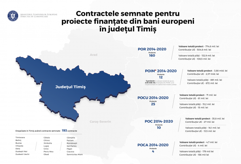 - 12 proiecte valoare de 3,88 miliarde lei finanțate prin Programul Operațional Infrastructură Mare (POIM) susțin dezvoltarea infrastructurii de transport, județul fiind traversat de importante coridoare ale rețelei europene de transport TEN-T, dar și cea de mediu prin investițiile de alimentarea cu apă sau infrastructura de canalizare și de gestionare a deșeurilor municipale. Este finanțată construirea terminalului de pasageri sosiri curse externe al Aeroportului Traian Vuia, autostrada Lugoj – Deva, autostrada Timișoara-Lugoj și varianta de ocolire a municipiului, la standard de autostradă.